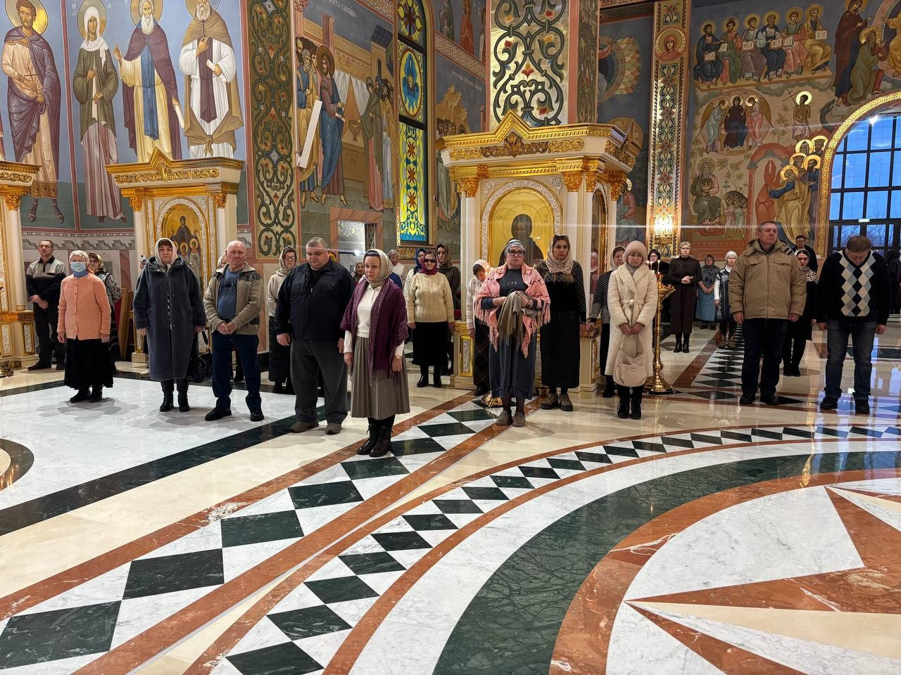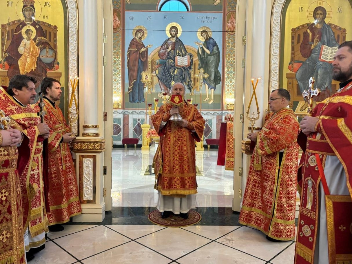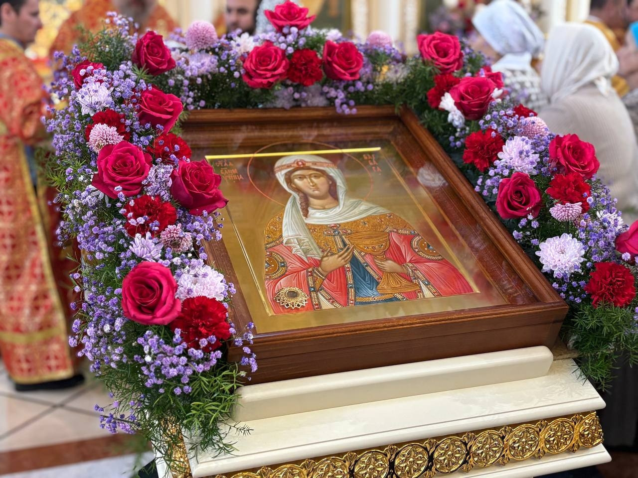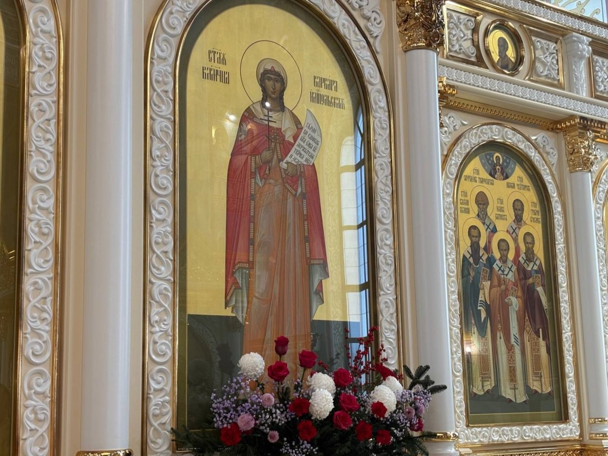 По заамвонной молитве сонм духовенства совершил славление и молитву святой великомученице Варваре пред её иконой в центре храма.